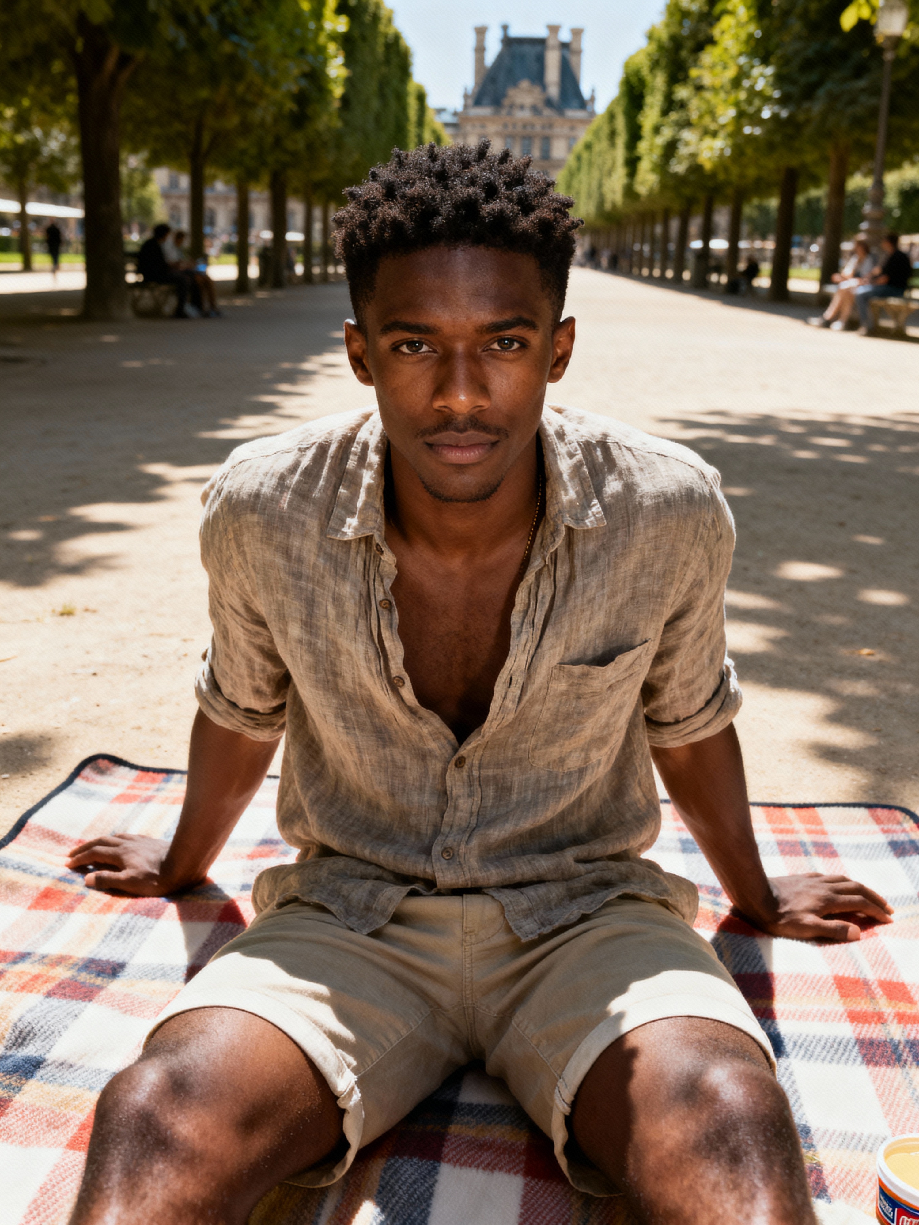 model at Tuileries Garden picnic, wearing bermuda shorts with a linen shirt, sitting on picnic blanket