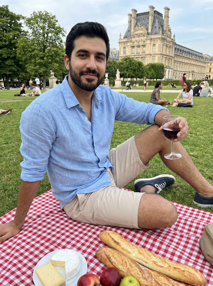 model at Tuileries Garden picnic, wearing bermuda shorts with a linen shirt, sitting on picnic blanket