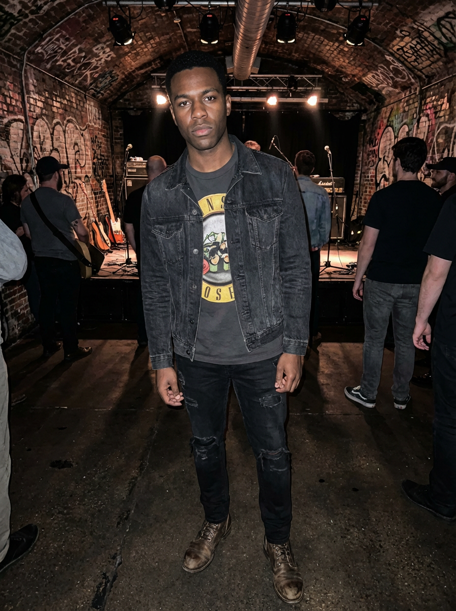 model at underground music venue, alternative scene aesthetic, edgy cool style