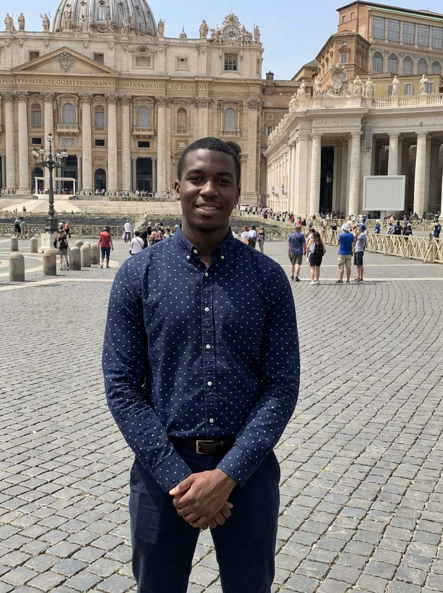 model at Vatican St Peters Square, impressive architecture, elegant modest attire, tourist scene