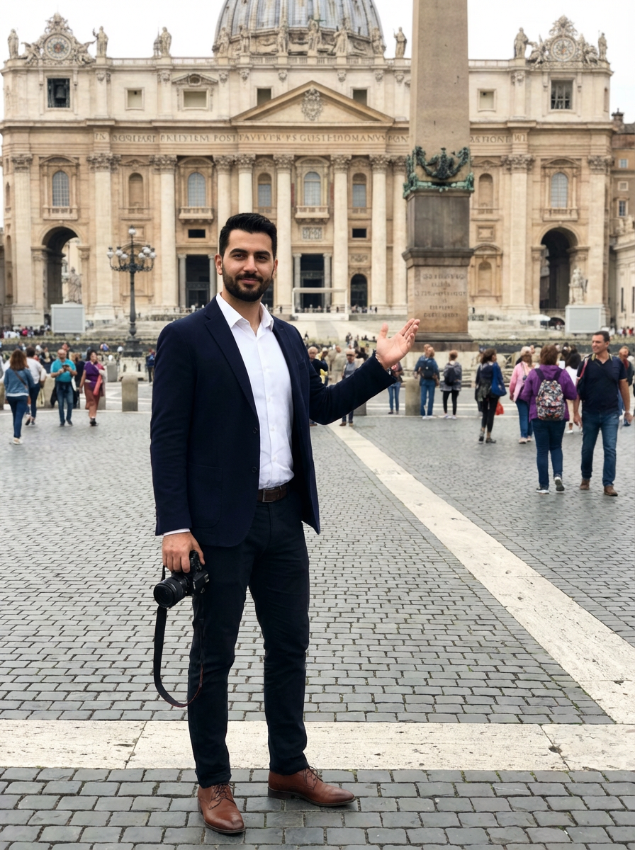 model at Vatican St Peters Square, impressive architecture, elegant modest attire, tourist scene