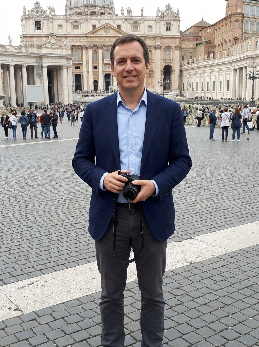 model at Vatican St Peters Square, impressive architecture, elegant modest attire, tourist scene