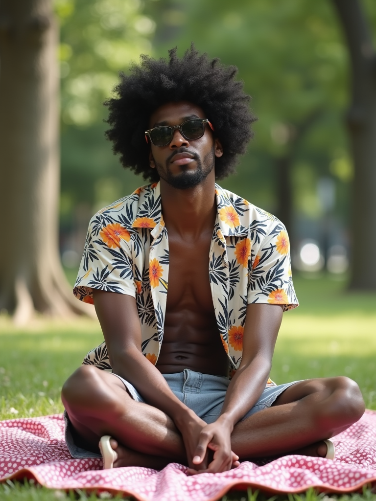 model at Yoyogi Park picnic, wearing bermuda shorts with a Hawaiian shirt, sitting on picnic blanket