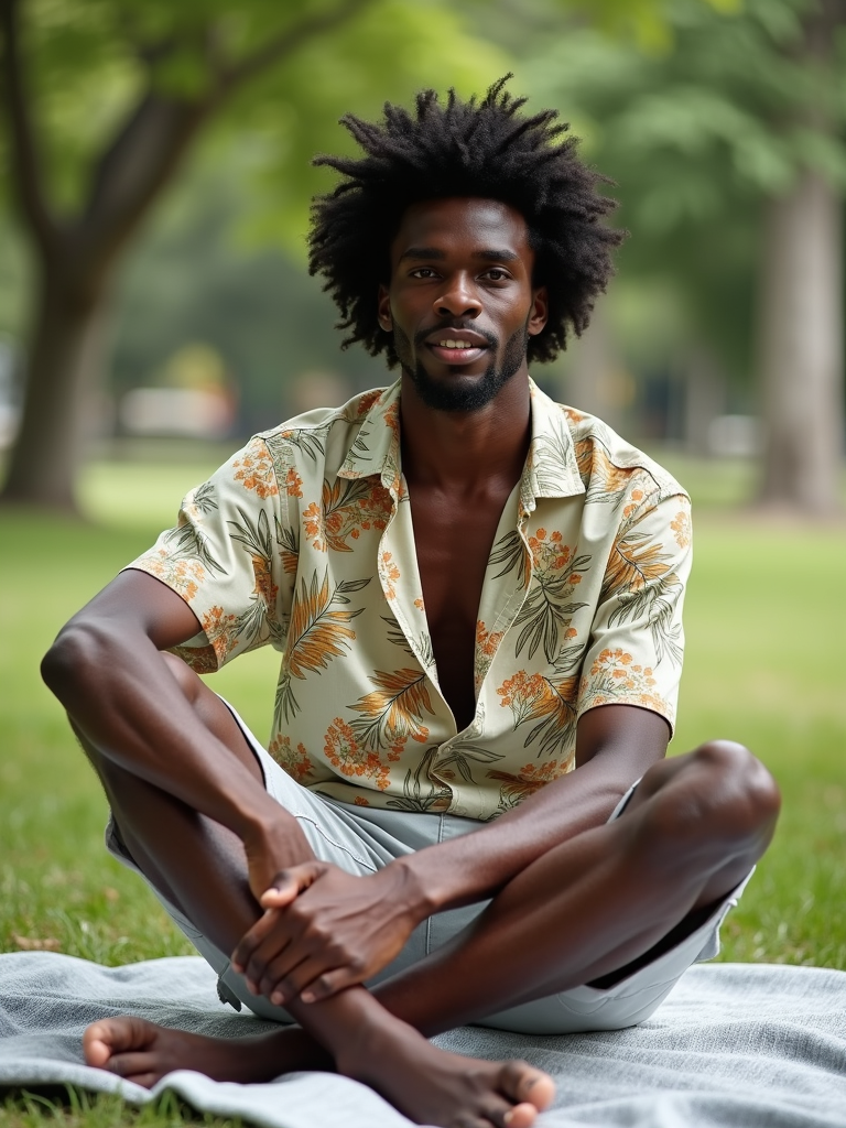 model at Yoyogi Park picnic, wearing bermuda shorts with a Hawaiian shirt, sitting on picnic blanket