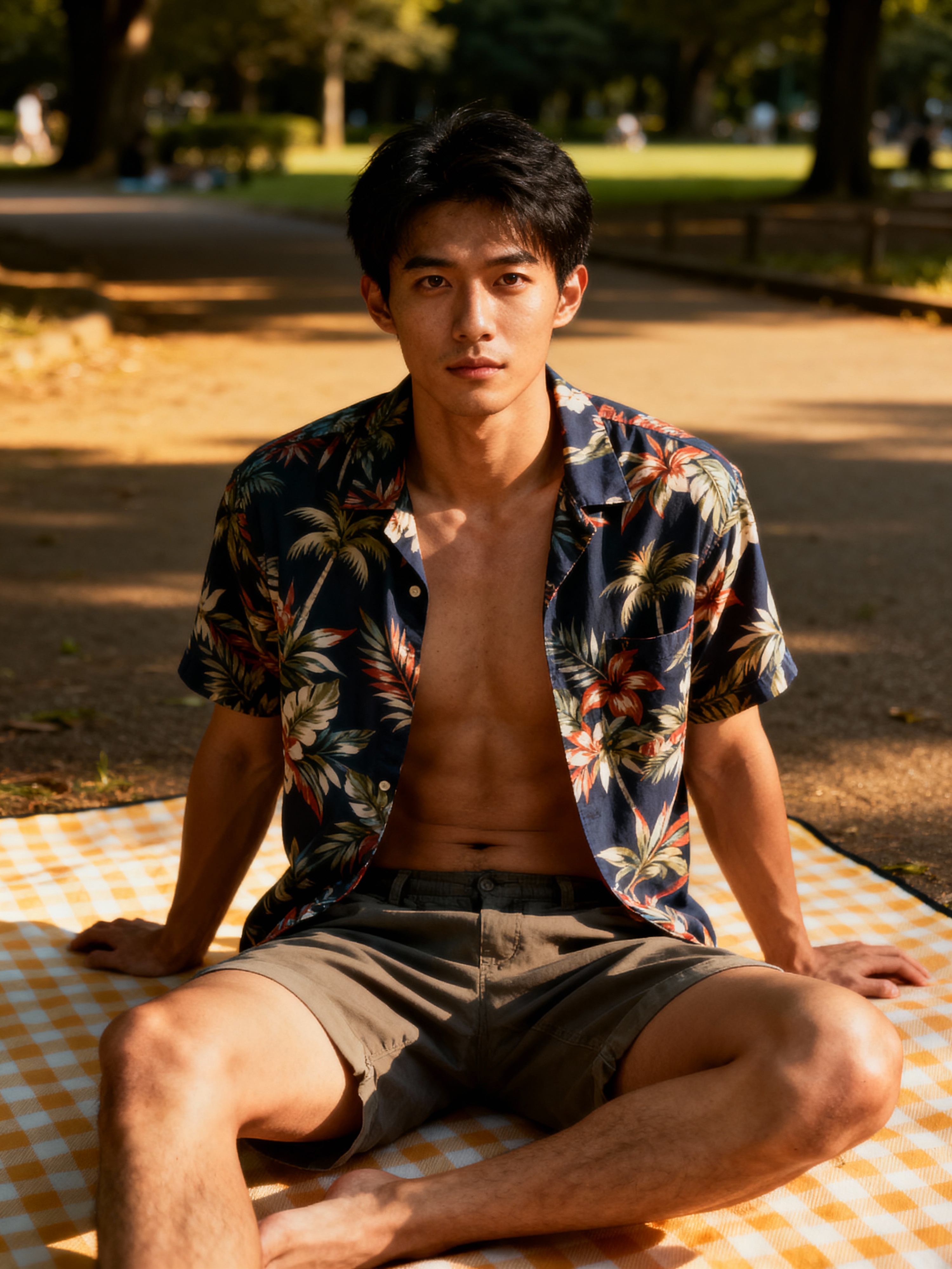 model at Yoyogi Park picnic, wearing bermuda shorts with a Hawaiian shirt, sitting on picnic blanket