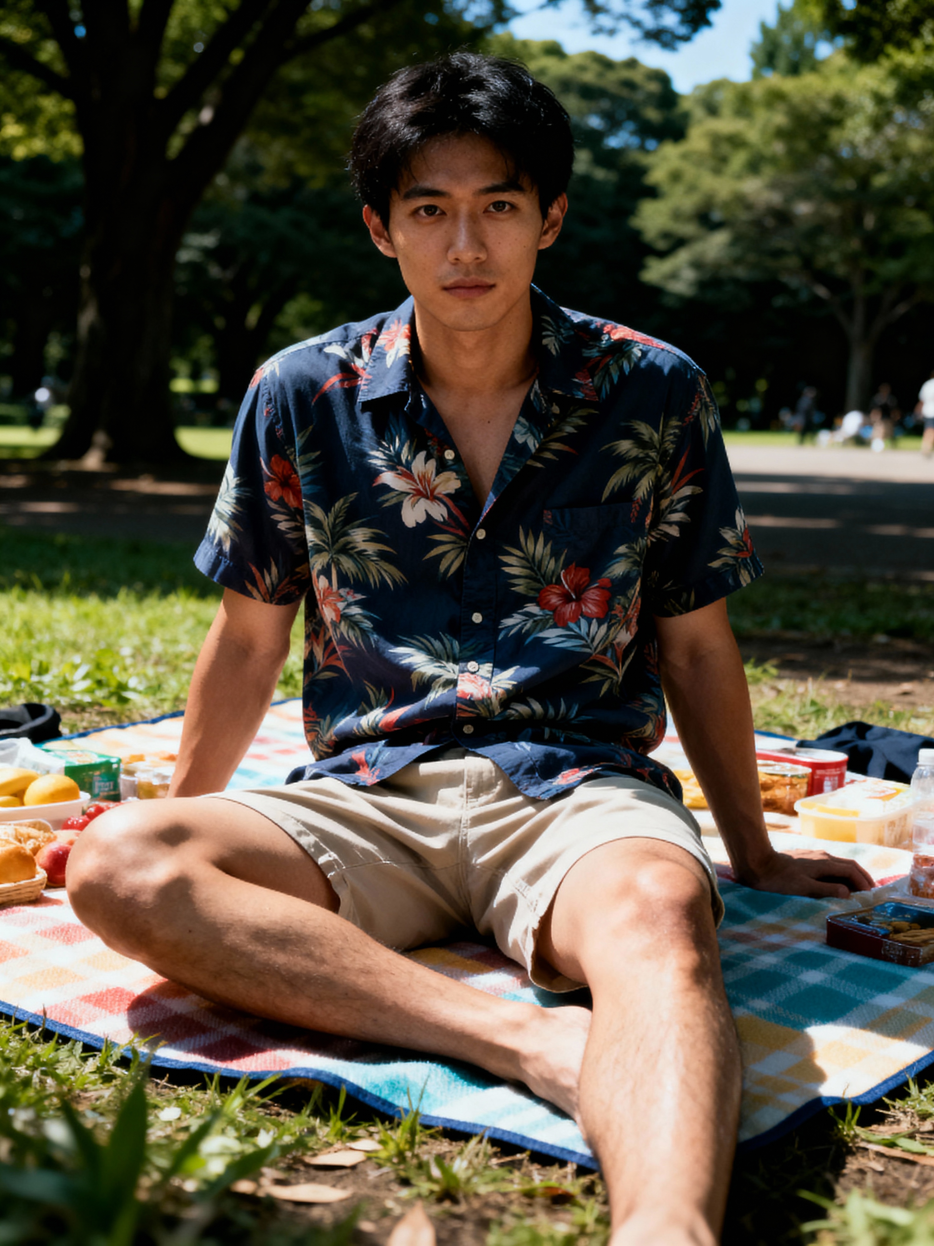 model at Yoyogi Park picnic, wearing bermuda shorts with a Hawaiian shirt, sitting on picnic blanket