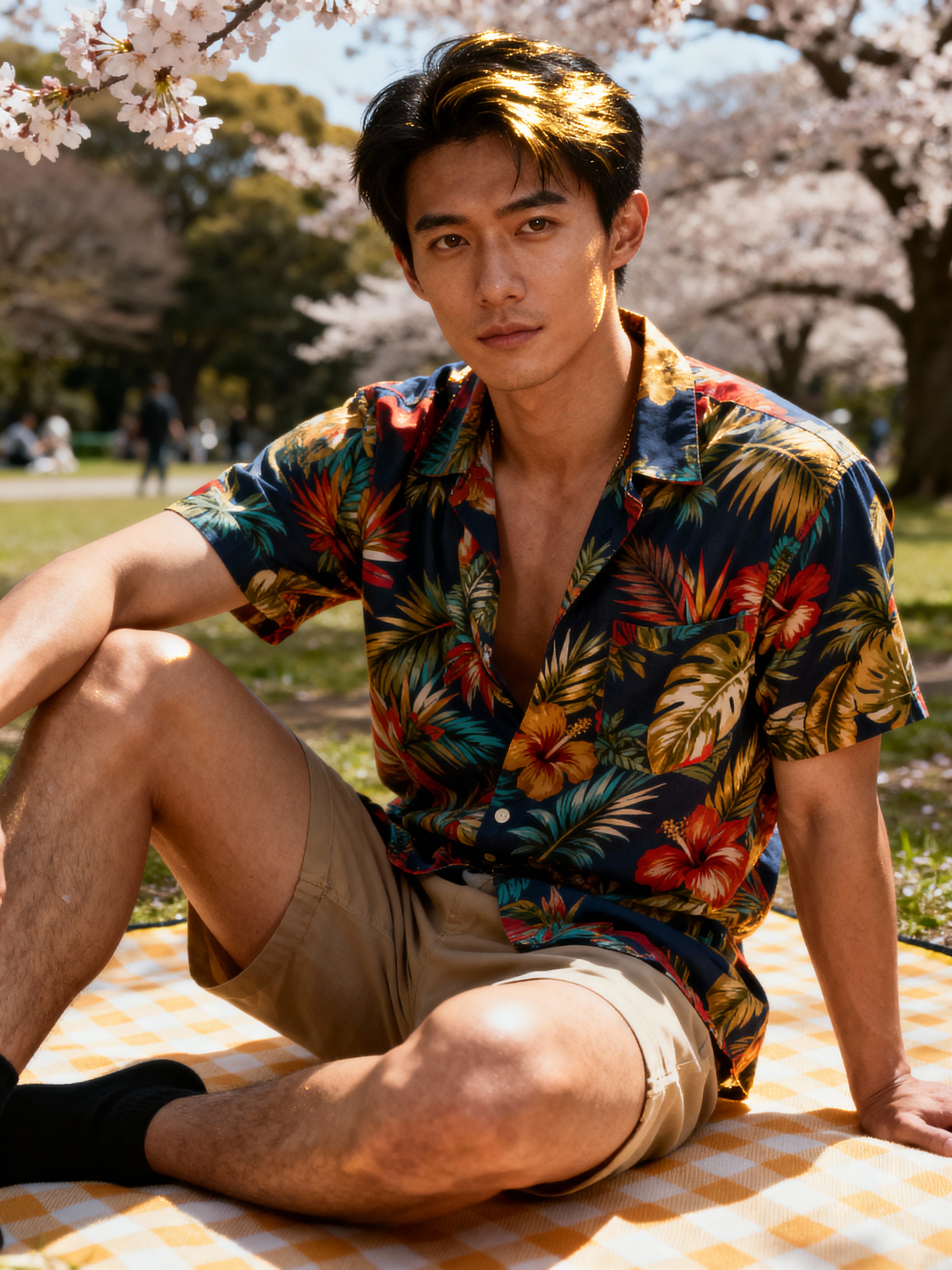 model at Yoyogi Park picnic, wearing bermuda shorts with a Hawaiian shirt, sitting on picnic blanket