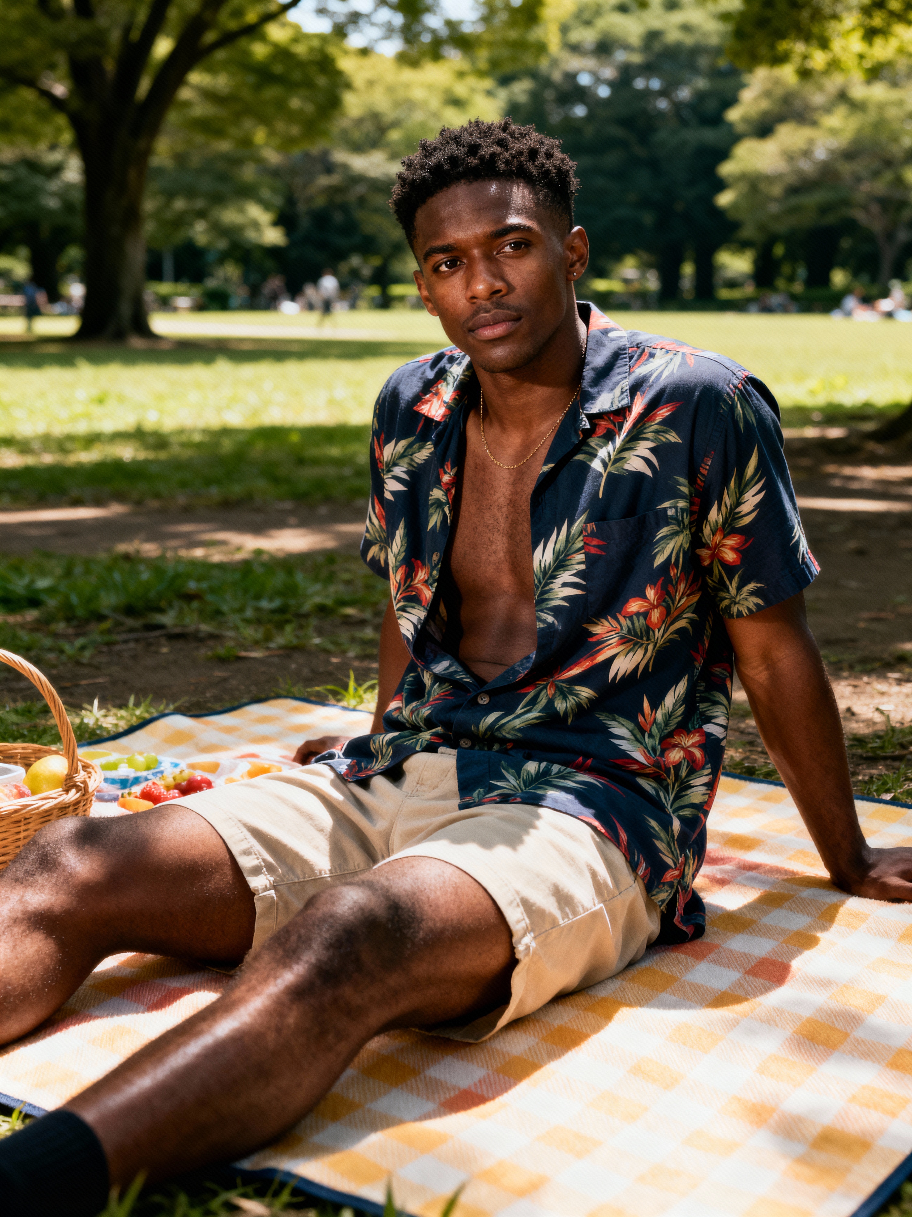 model at Yoyogi Park picnic, wearing bermuda shorts with a Hawaiian shirt, sitting on picnic blanket