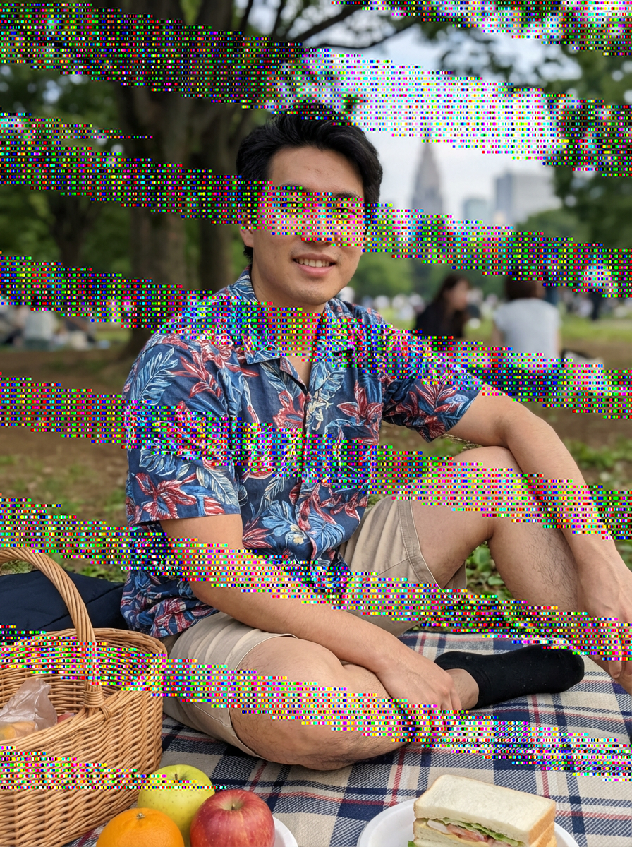 model at Yoyogi Park picnic, wearing bermuda shorts with a Hawaiian shirt, sitting on picnic blanket