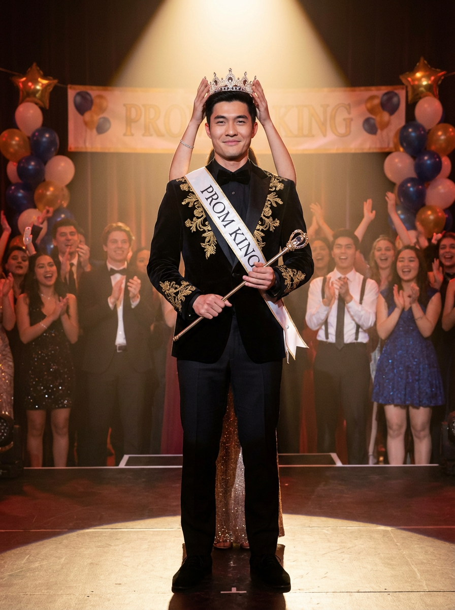 model being crowned prom royalty, tiara or crown moment, king moment, spotlight scene