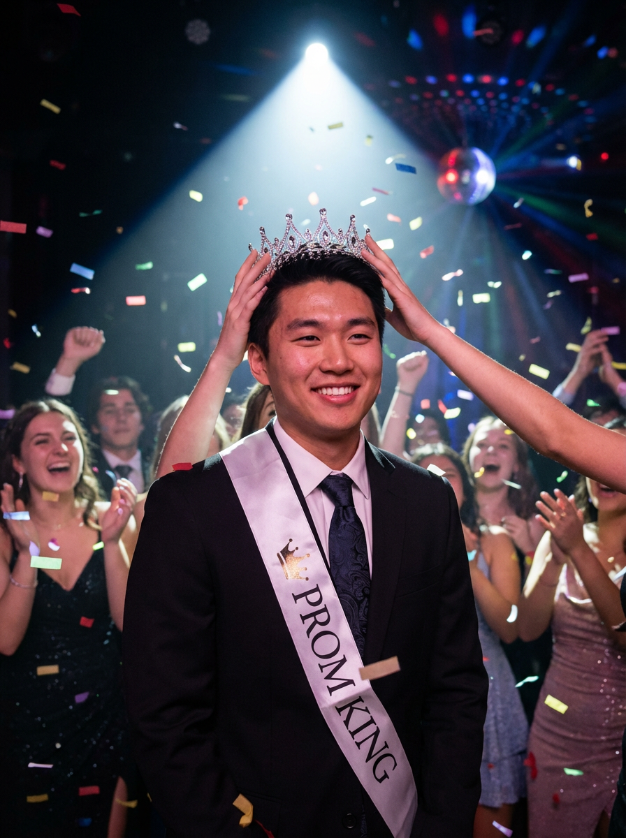 model being crowned prom royalty, tiara or crown moment, king moment, spotlight scene