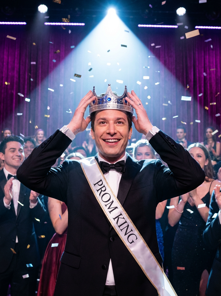 model being crowned prom royalty, tiara or crown moment, king moment, spotlight scene