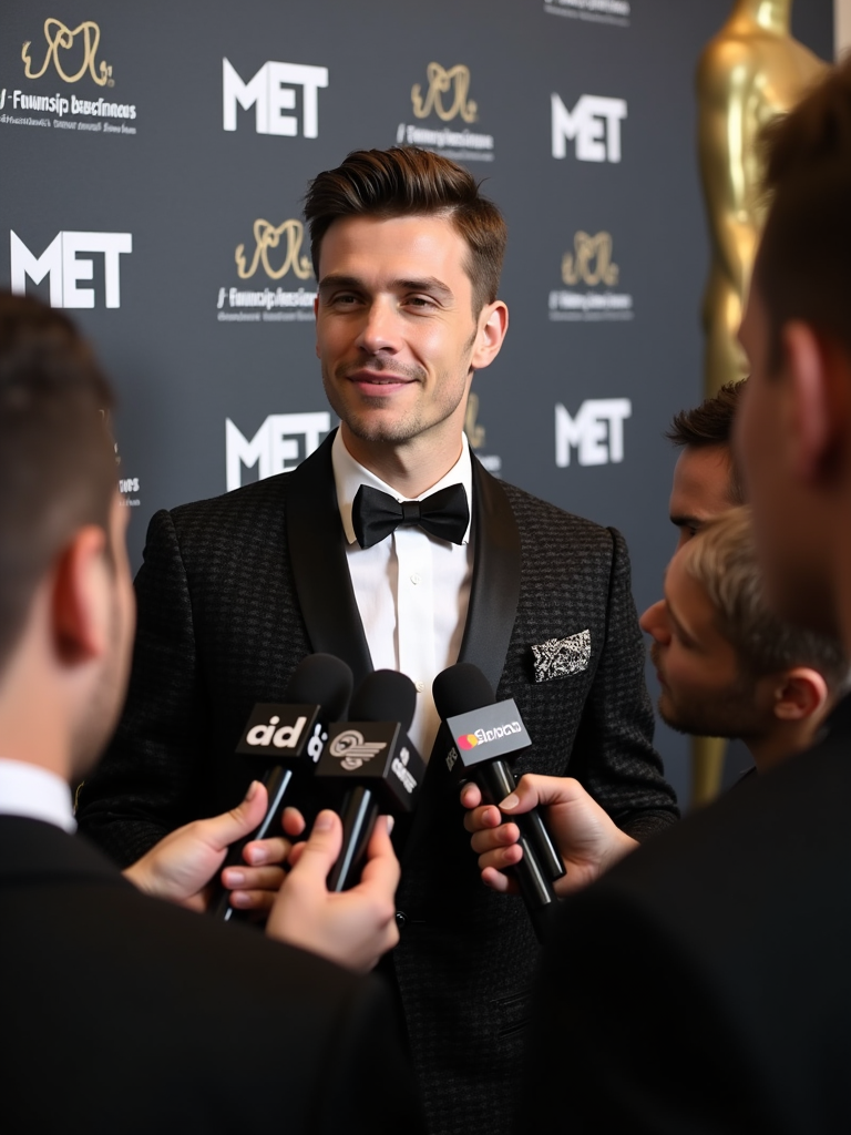 model being interviewed by fashion reporters at the Met Gala media wall, wearing an elegant tuxedo with unexpected textures, press and media backdrop with Met Gala logo and sponsors