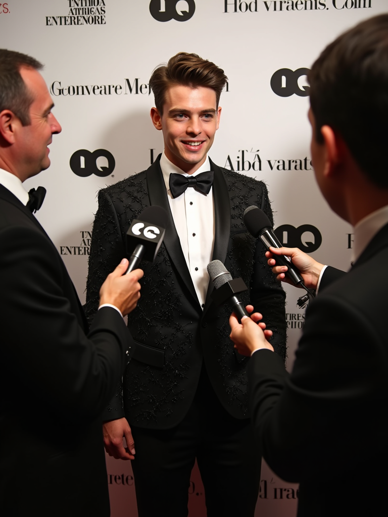 model being interviewed by fashion reporters at the Met Gala media wall, wearing an elegant tuxedo with unexpected textures, press and media backdrop with Met Gala logo and sponsors