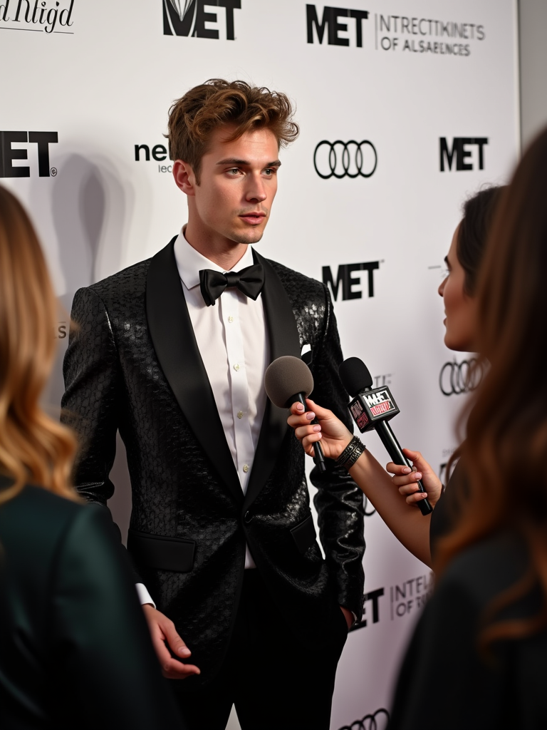 model being interviewed by fashion reporters at the Met Gala media wall, wearing an elegant tuxedo with unexpected textures, press and media backdrop with Met Gala logo and sponsors