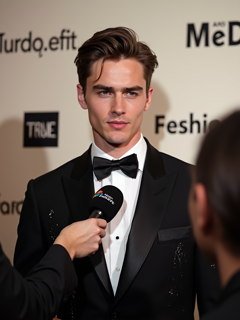 model being interviewed by fashion reporters at the Met Gala media wall, wearing an elegant tuxedo with unexpected textures, press and media backdrop with Met Gala logo and sponsors