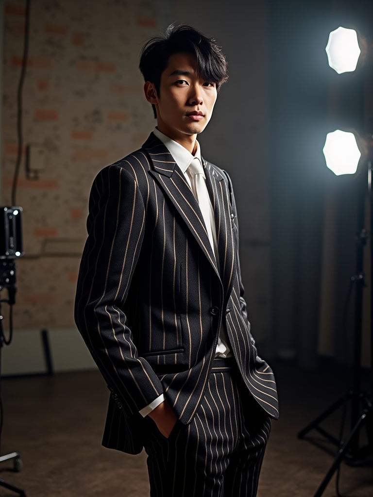 model being photographed by Vogue at the Met Gala photo booth, wearing an avant-garde suit challenging traditional menswear, professional lighting setup with Met Gala branding