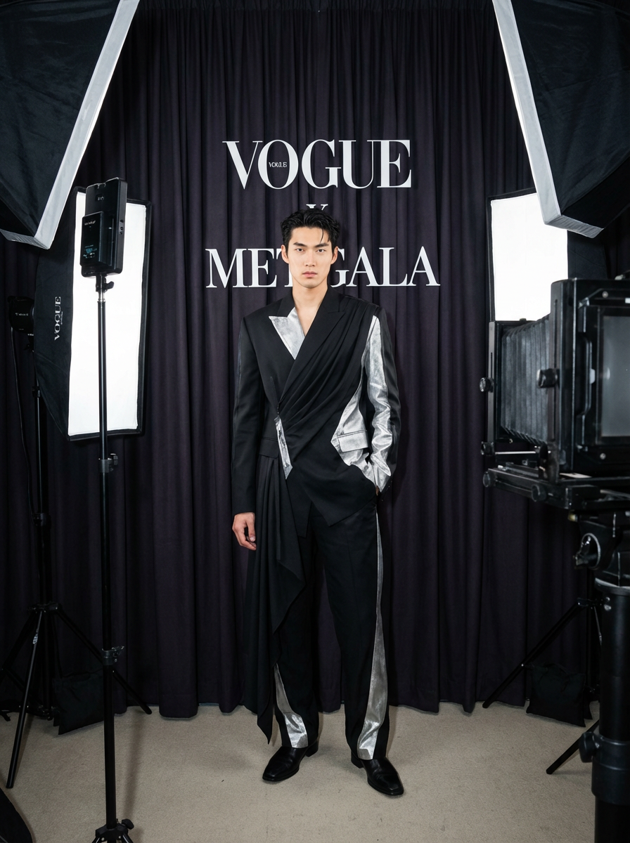 model being photographed by Vogue at the Met Gala photo booth, wearing an avant-garde suit challenging traditional menswear, professional lighting setup with Met Gala branding