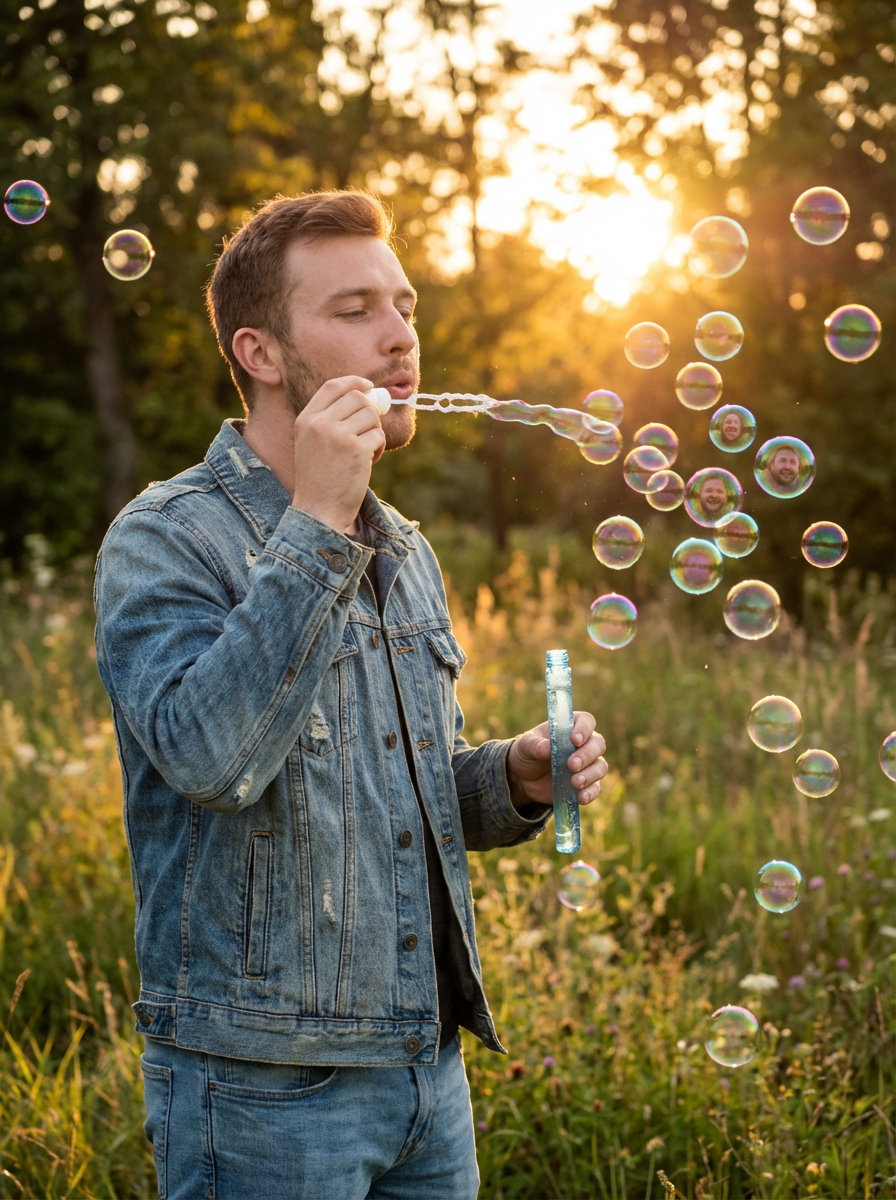 model blowing bubbles. all around her are floating bubbles. many bubbles floating. the bubbles reflect her face. it is golden hour at sunset.