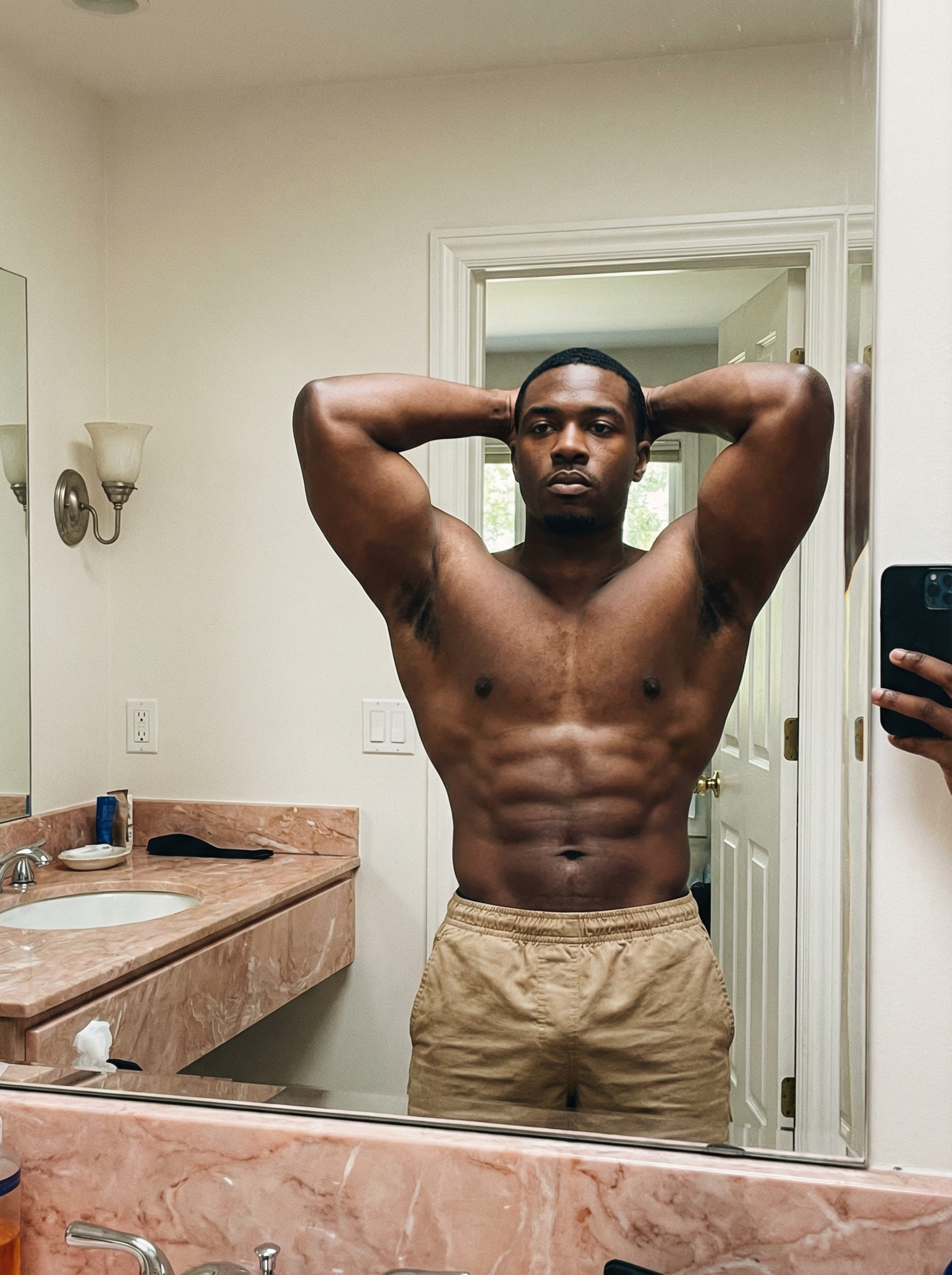model, candid bathroom mirror photo, athletic looksmaxxing looksmaxxer posing with arms behind head, wide lats + defined abs + v-taper, serious calm expression; sharp jawline, high cheekbones, straight nose, thick brows, clear skin texture, defined lips, short dark wavy hair; wearing tan shorts, shirtless ; rose pink marble sink counter + wall sconce + open door background, soft indoor lighting + natural daylight, 35mm, realistic smartphone photo