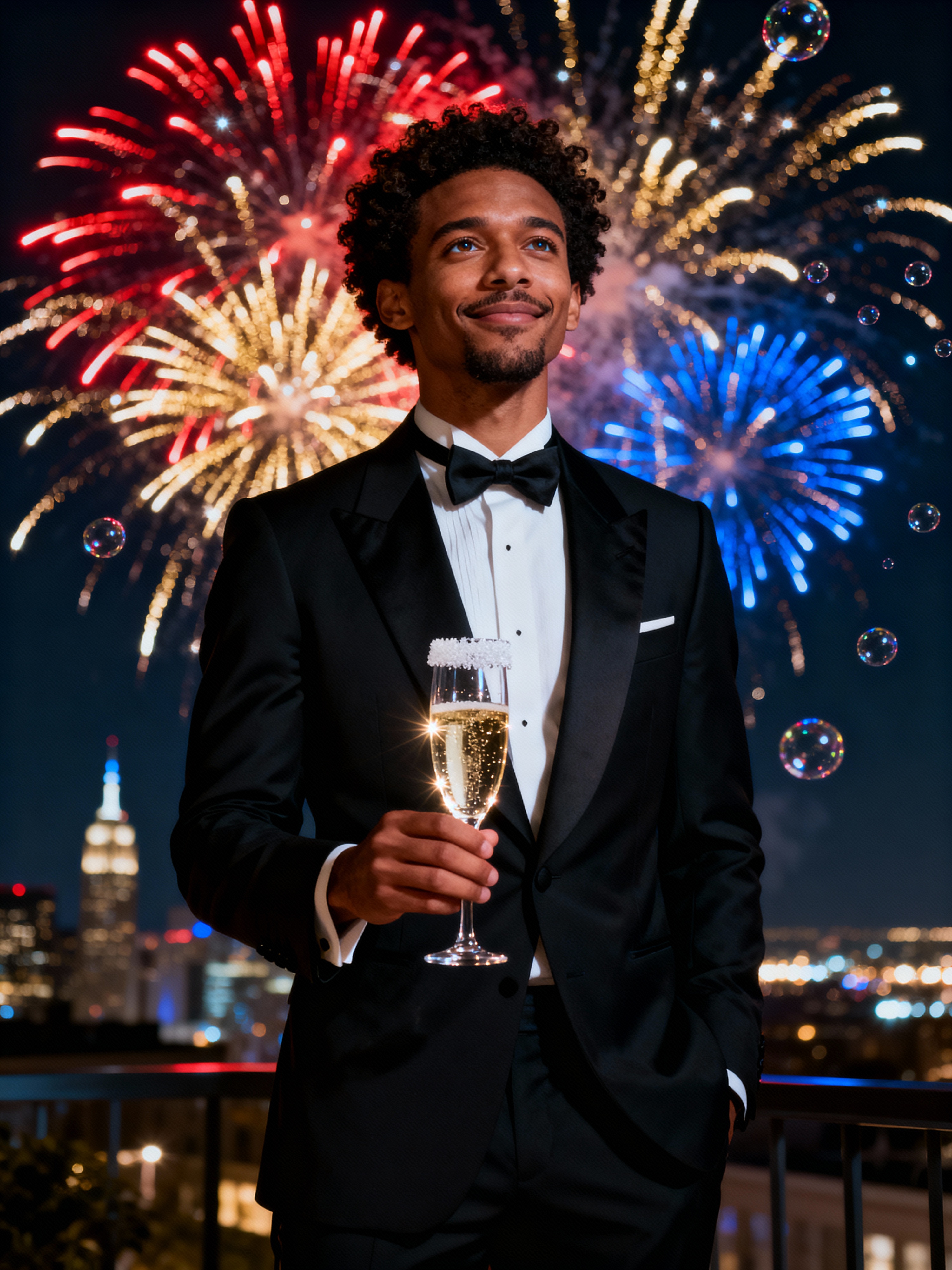 model celebrating New Year's Eve with champagne and Fireworks in background