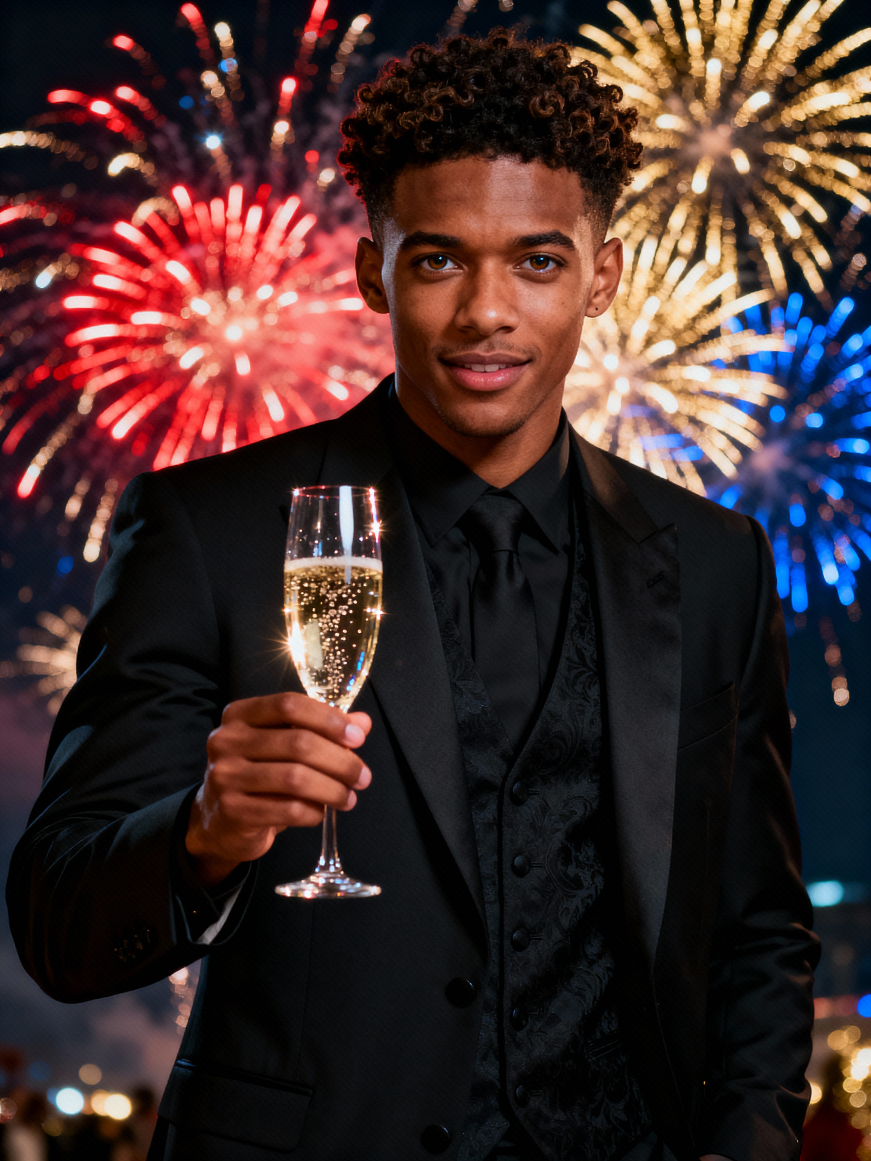 model celebrating New Year's Eve with champagne and Fireworks in background