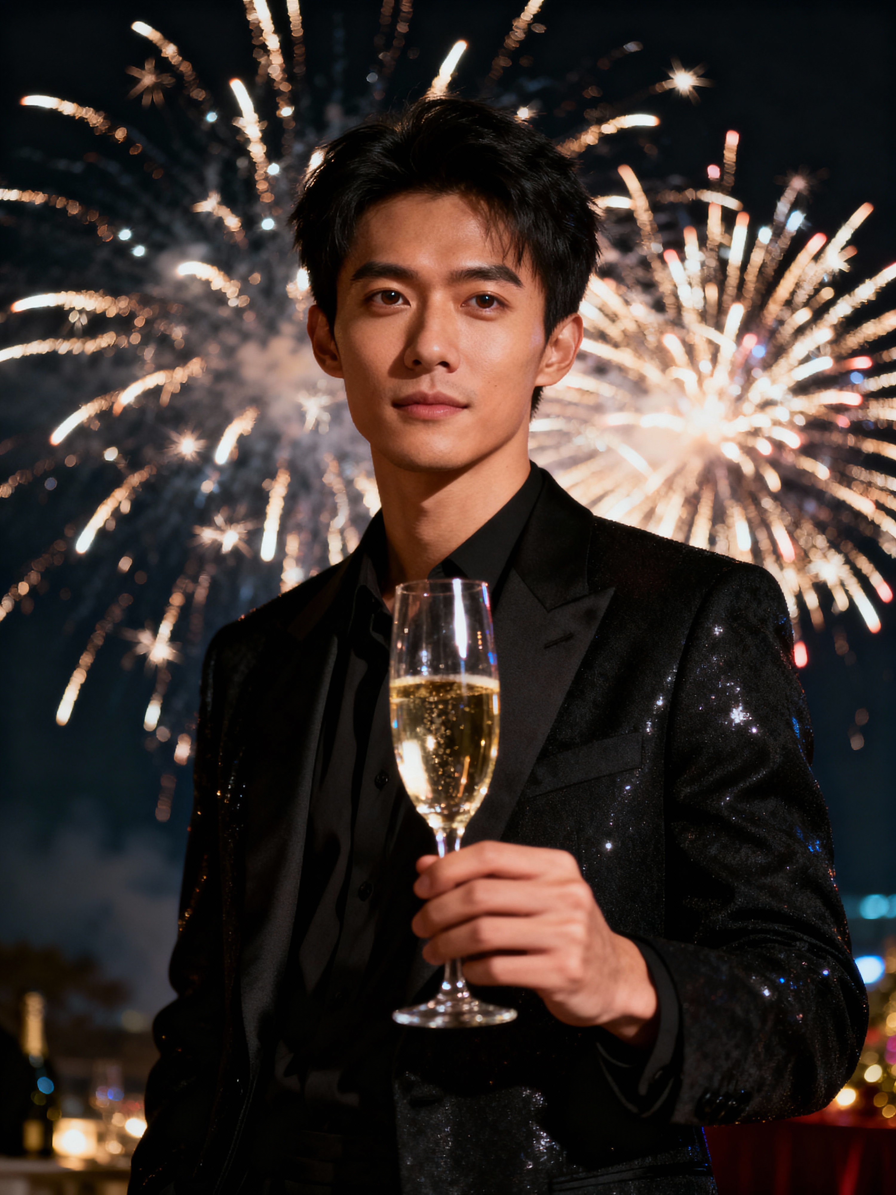 model celebrating New Year's Eve with champagne and Fireworks in background