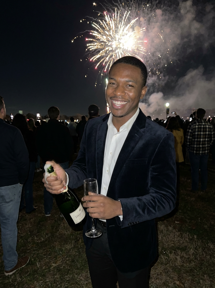 model celebrating New Year's Eve with champagne and Fireworks in background