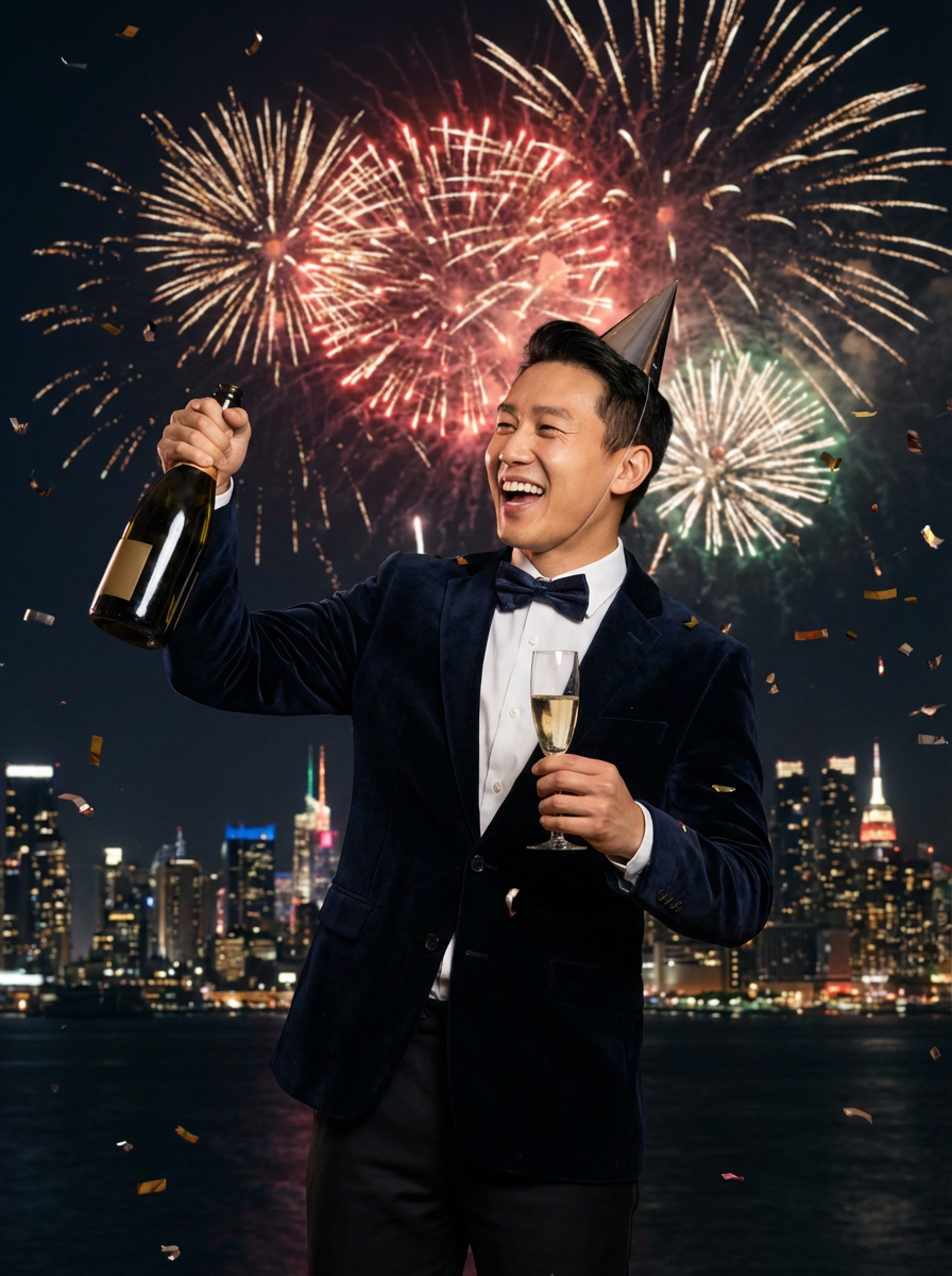model celebrating New Year's Eve with champagne and Fireworks in background