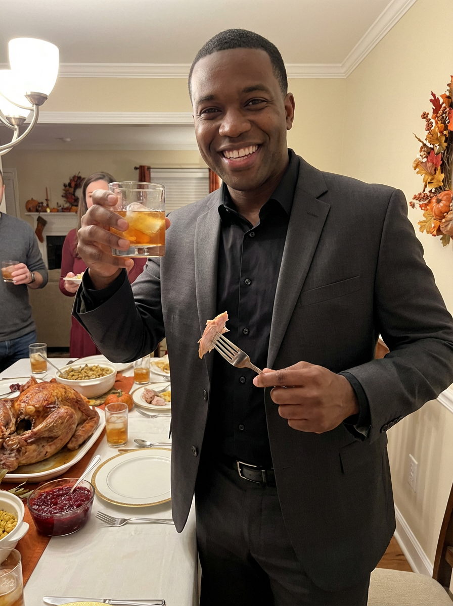 model celebrating Thanksgiving with cocktail and turkey meat in background