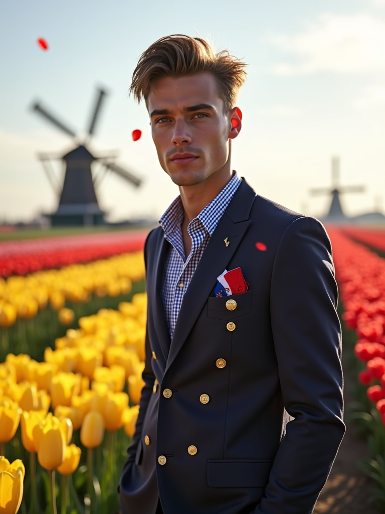 model confidently posed in Amsterdam during tulip season, surrounded by vibrant fields of blue, yellow, and red flowers. He is dressed in classic Dutch-inspired clothes with European touches, adorned with a smart casual outfit with European flag pocket square, traditional windmills visible in the background. The scene is enhanced by golden sunlight and a gentle breeze carrying flower petals.