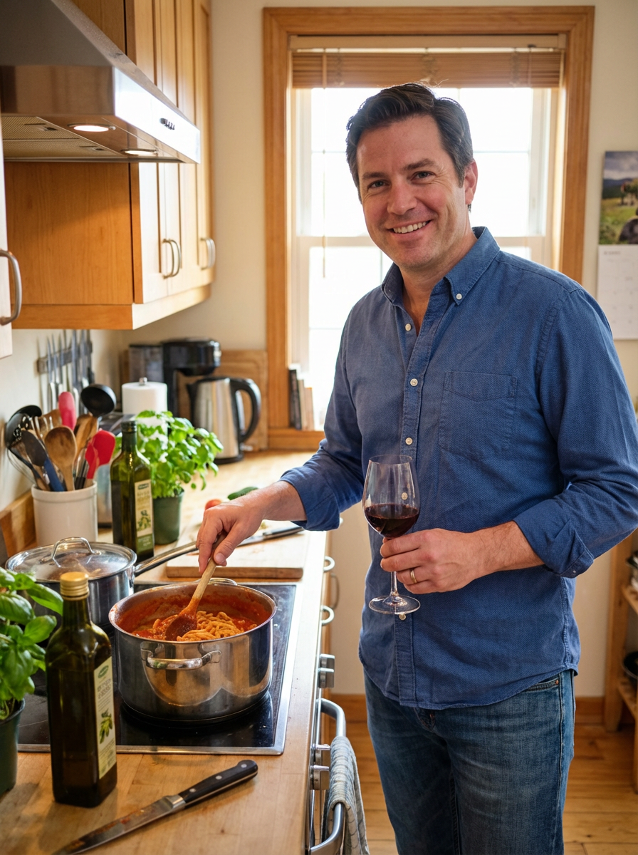 model cooking in kitchen, domestic happy moment, casual home clothes, warm inviting scene