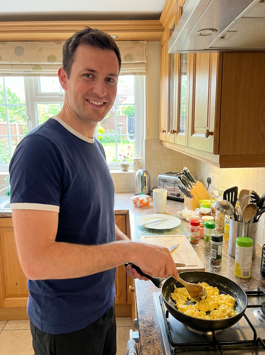 model cooking in kitchen, domestic happy moment, casual home clothes, warm inviting scene
