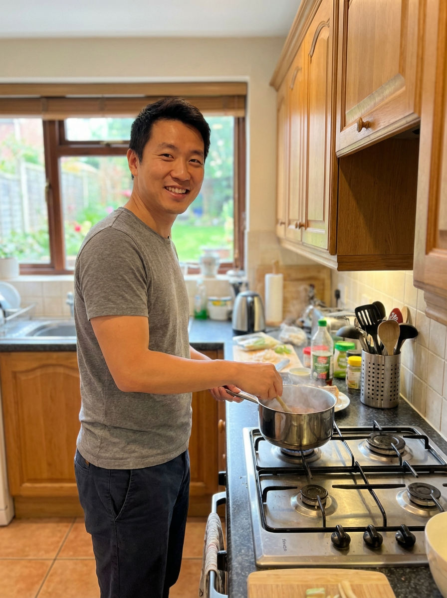 model cooking in kitchen, domestic happy moment, casual home clothes, warm inviting scene