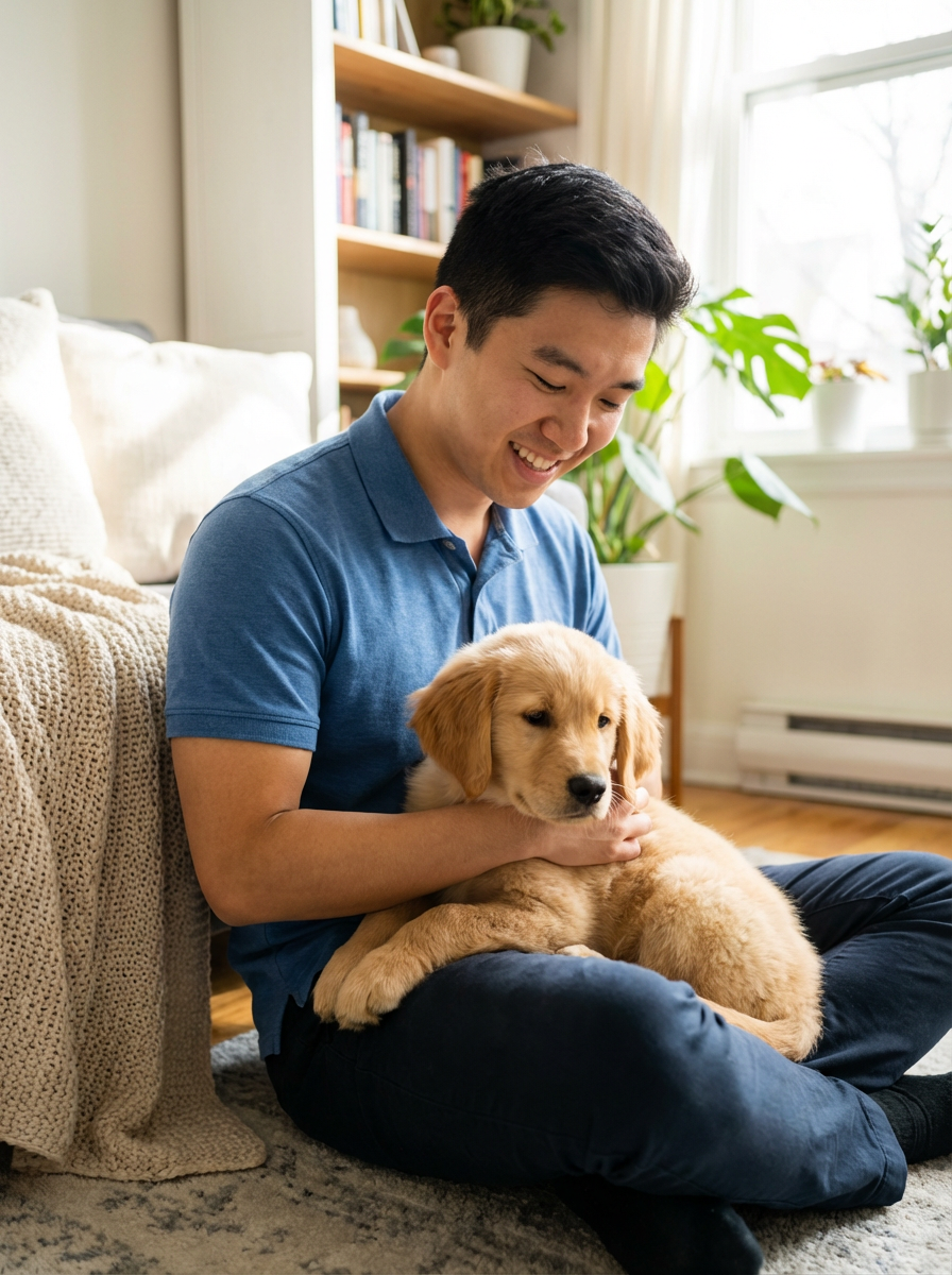 model cuddling with adorable golden retriever puppy, warm smile, cozy living room setting, soft natural lighting