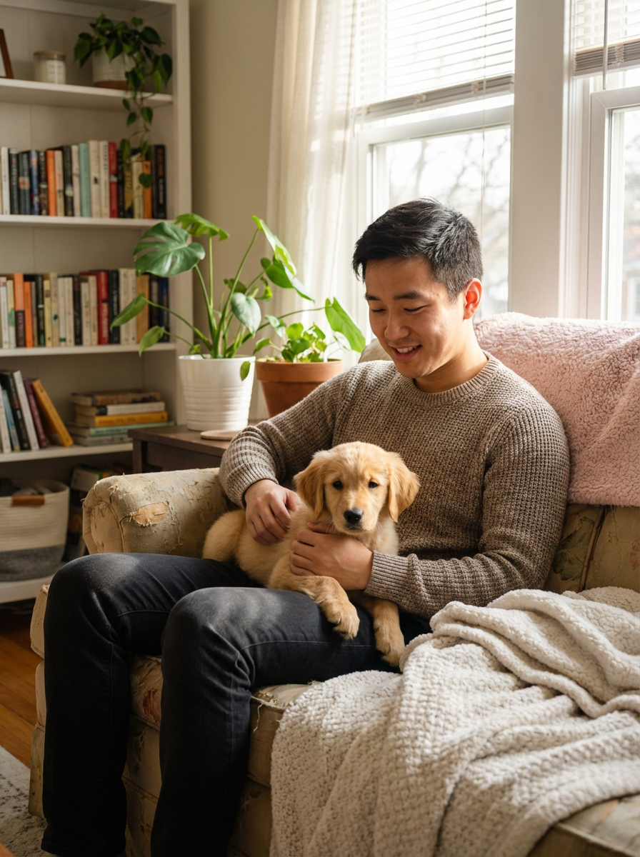 model cuddling with adorable golden retriever puppy, warm smile, cozy living room setting, soft natural lighting