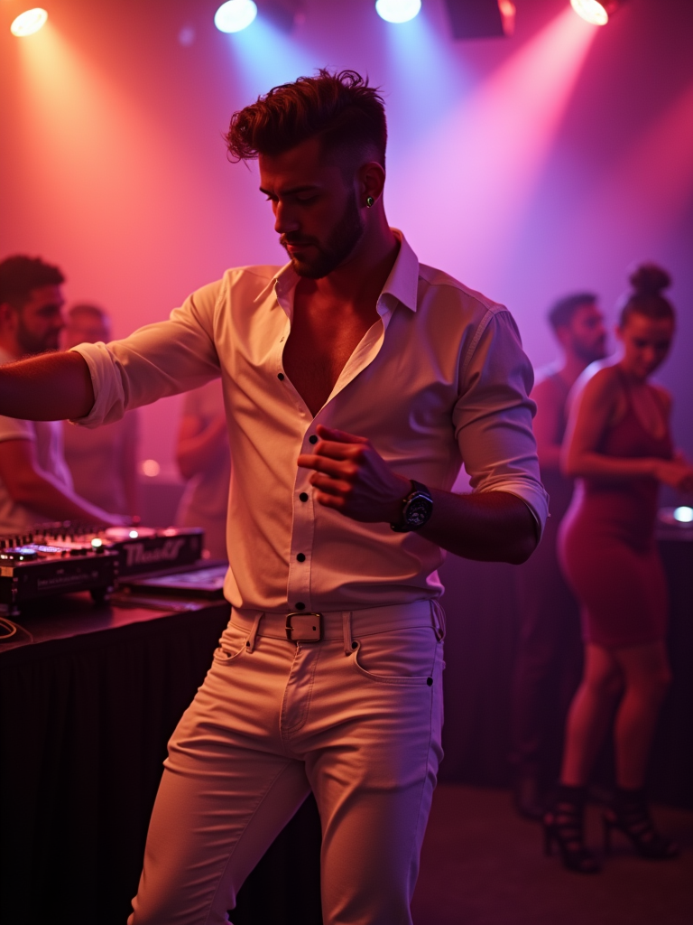 model dancing at an open-air club, wearing white jeans with a stylish fitted shirt, DJ lights and vibrant atmosphere