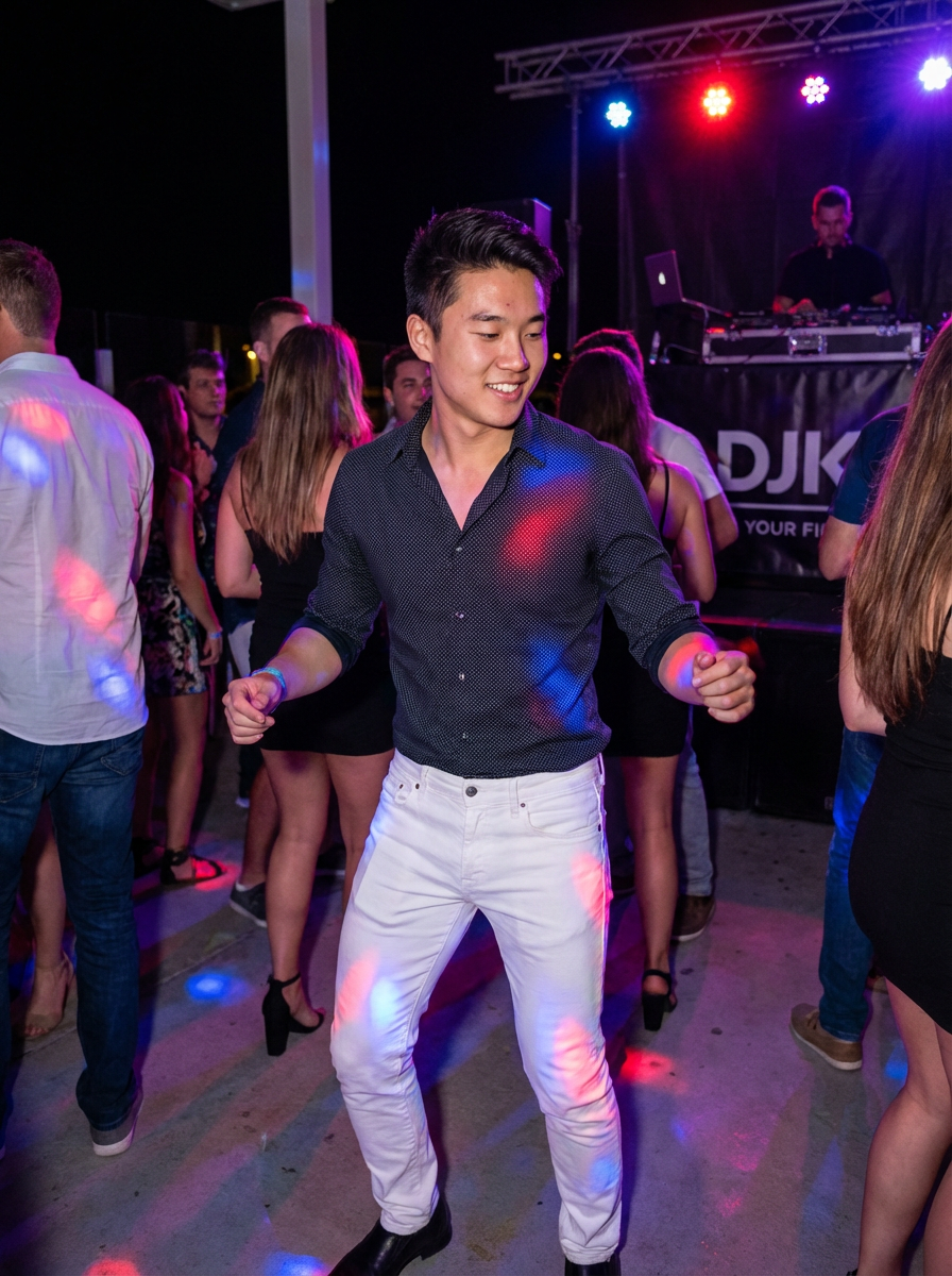 model dancing at an open-air club, wearing white jeans with a stylish fitted shirt, DJ lights and vibrant atmosphere