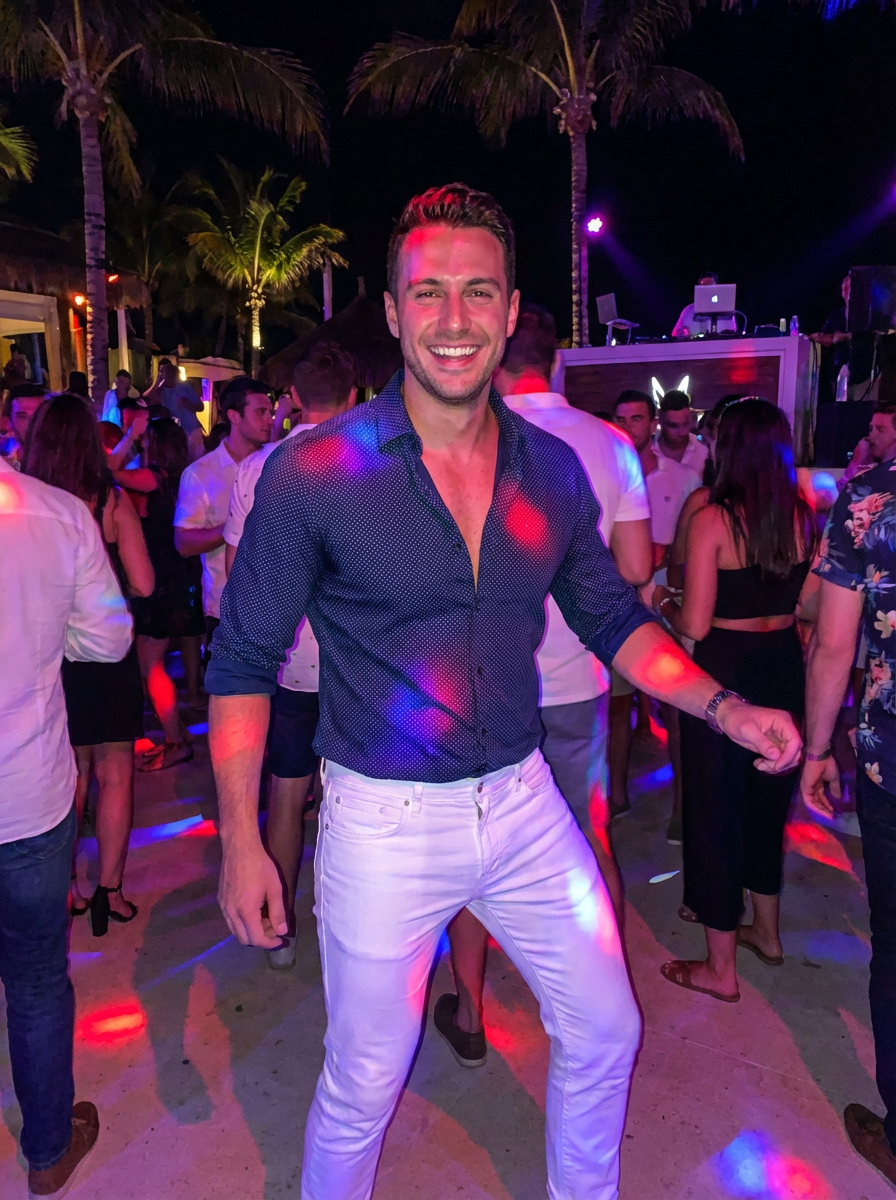 model dancing at an open-air club, wearing white jeans with a stylish fitted shirt, DJ lights and vibrant atmosphere