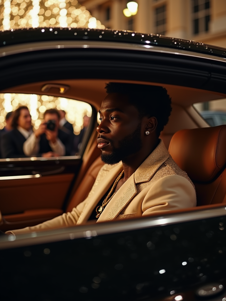 model departing the Met Gala in a luxury vehicle, wearing a refined evening ensemble with subtle luxury details, paparazzi and fans outside the Metropolitan Museum with event lighting visible