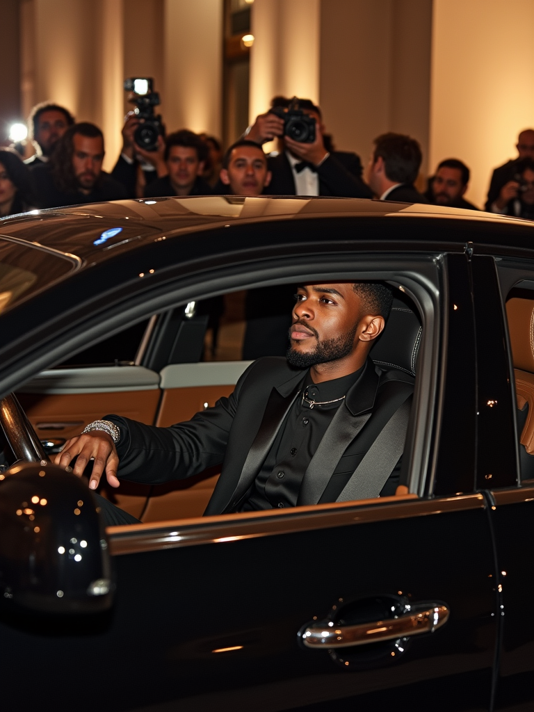 model departing the Met Gala in a luxury vehicle, wearing a refined evening ensemble with subtle luxury details, paparazzi and fans outside the Metropolitan Museum with event lighting visible