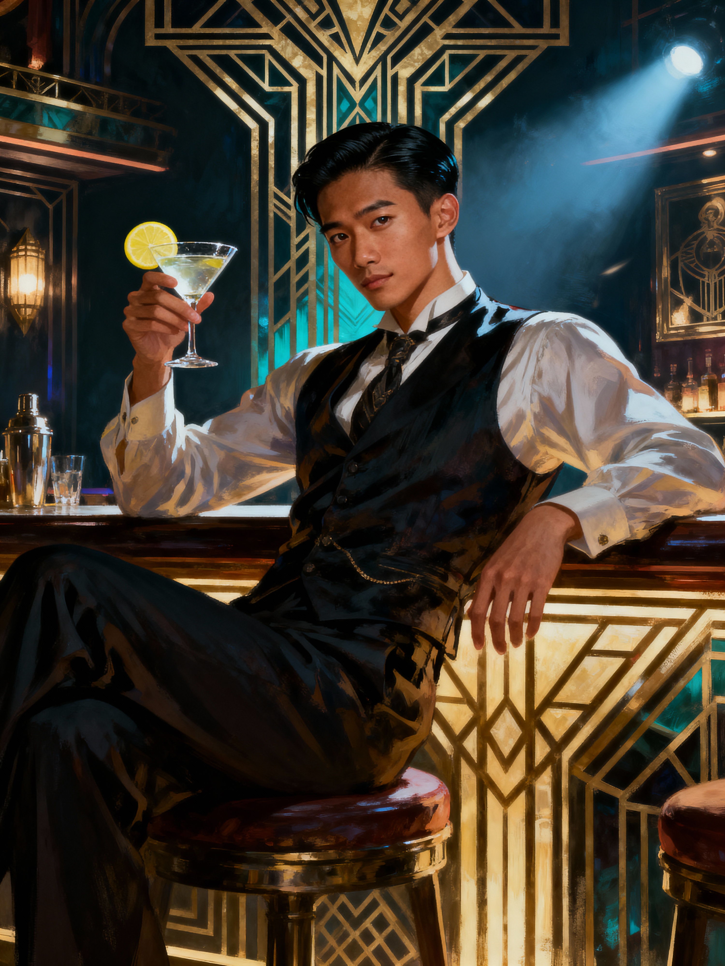model, dimly lit upscale 1920s speakeasy, relaxed pose, fantasy, art deco, detailed painterly digital art style by coles phillips and alfred charles parker, πΈπ