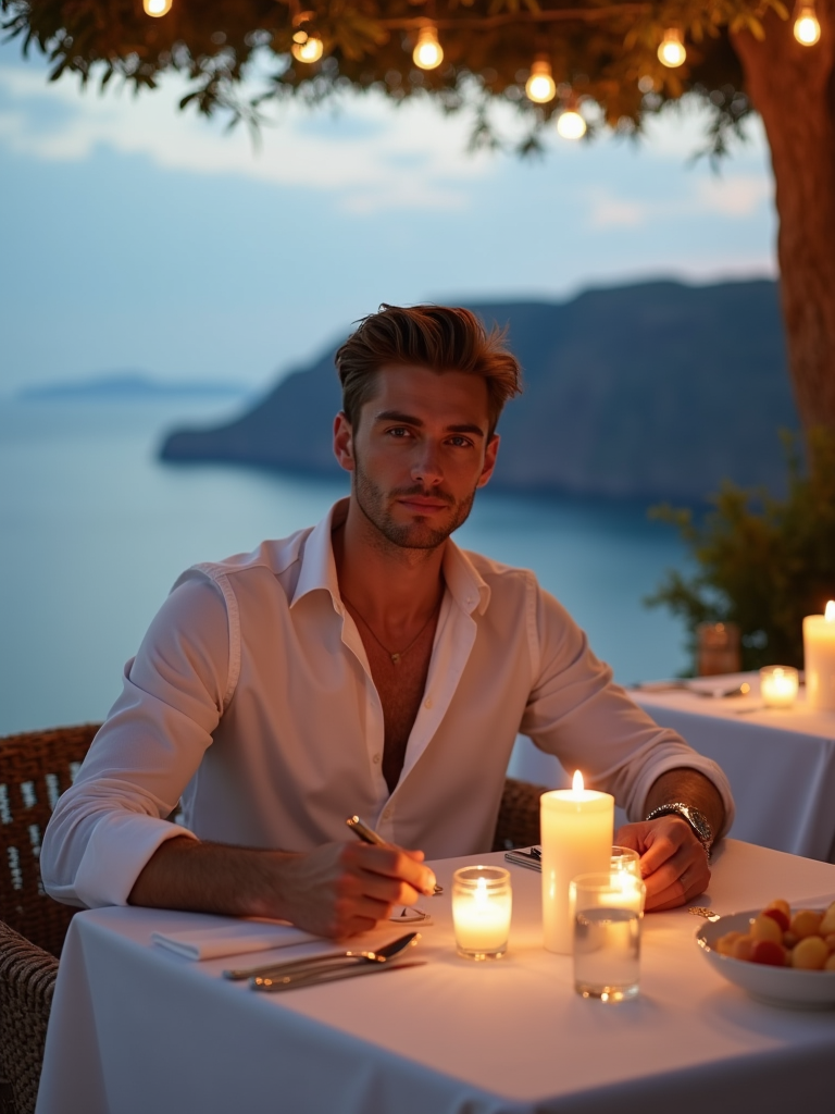 model dining at a cliffside restaurant, wearing a smart casual white outfit, candlelit tables with caldera views