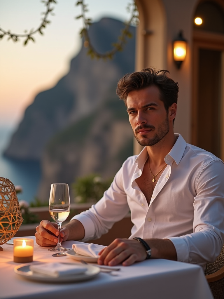 model dining at a cliffside restaurant, wearing a smart casual white outfit, candlelit tables with caldera views