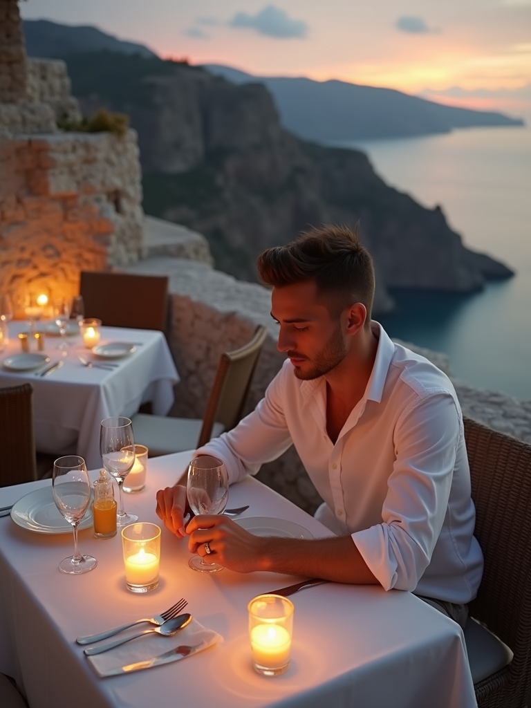 model dining at a cliffside restaurant, wearing a smart casual white outfit, candlelit tables with caldera views