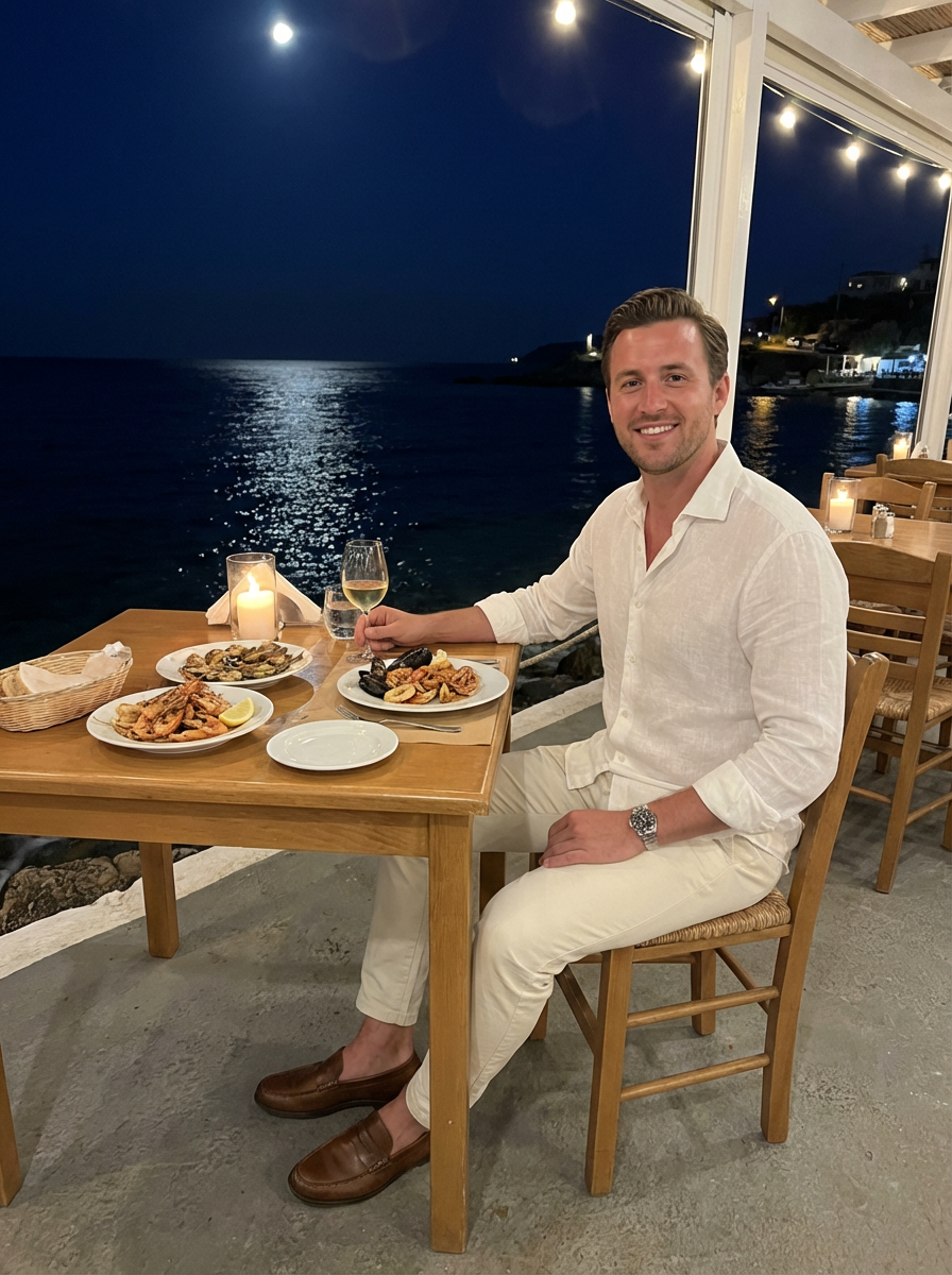model dining at a seaside taverna, wearing a smart casual white outfit, candlelit tables and ocean view