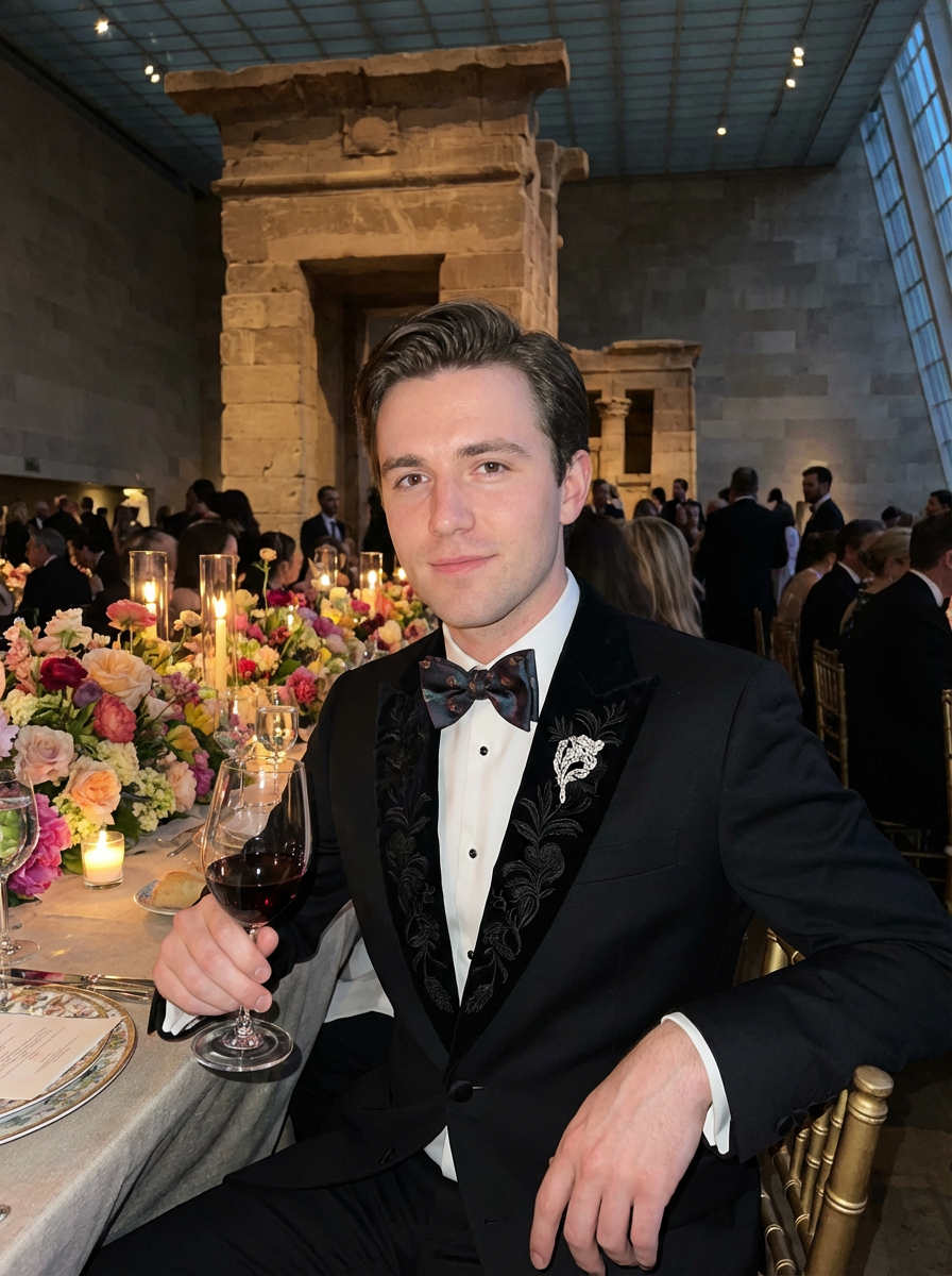model dining at the lavish Met Gala dinner in the Temple of Dendur, wearing a refined tuxedo with creative details, elaborate floral centerpieces and candlelit tables arranged throughout the museum space