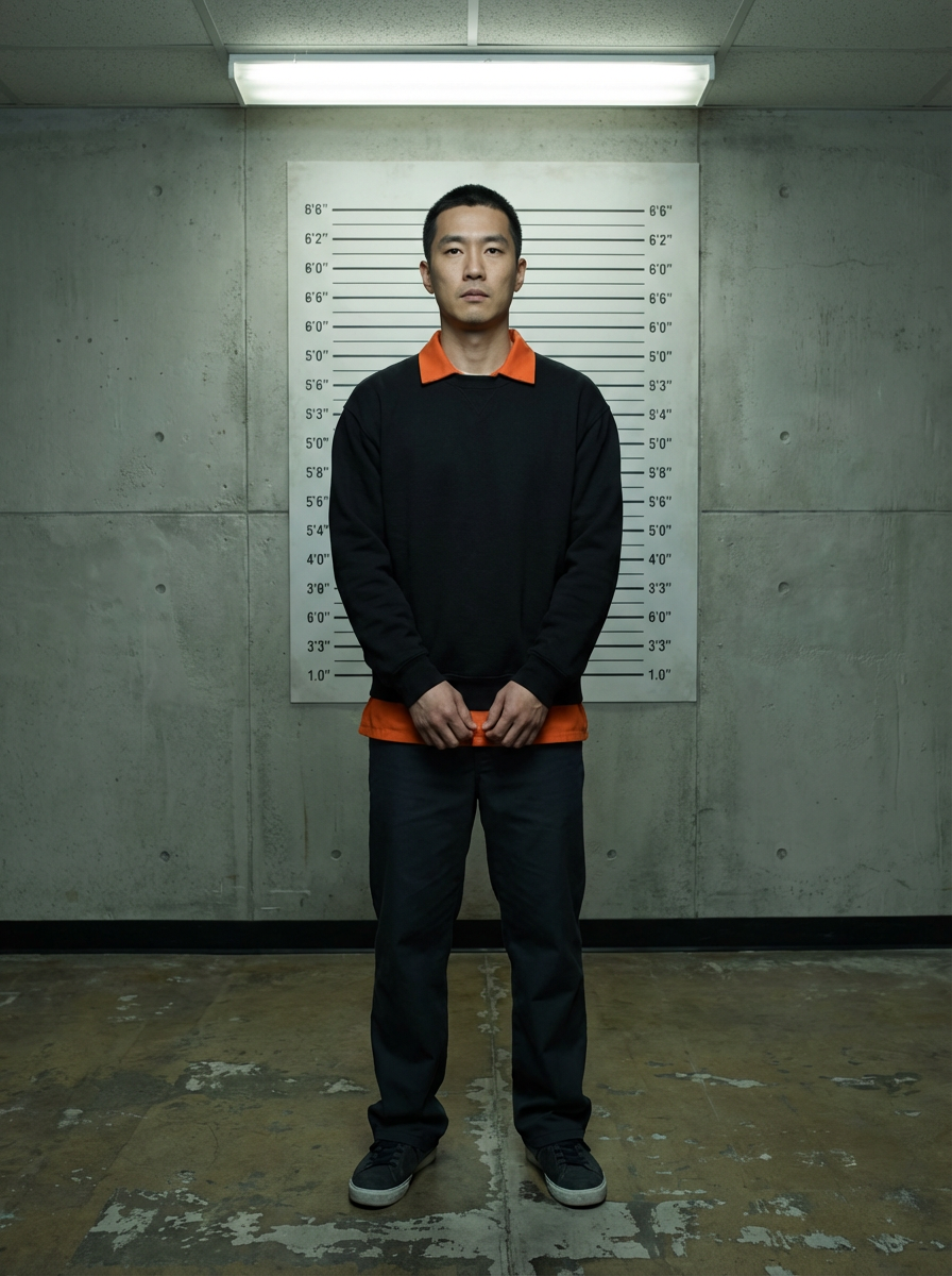 model doing classic mugshot pose, stoic face, orange jumpsuit visible at collar, institutional setting