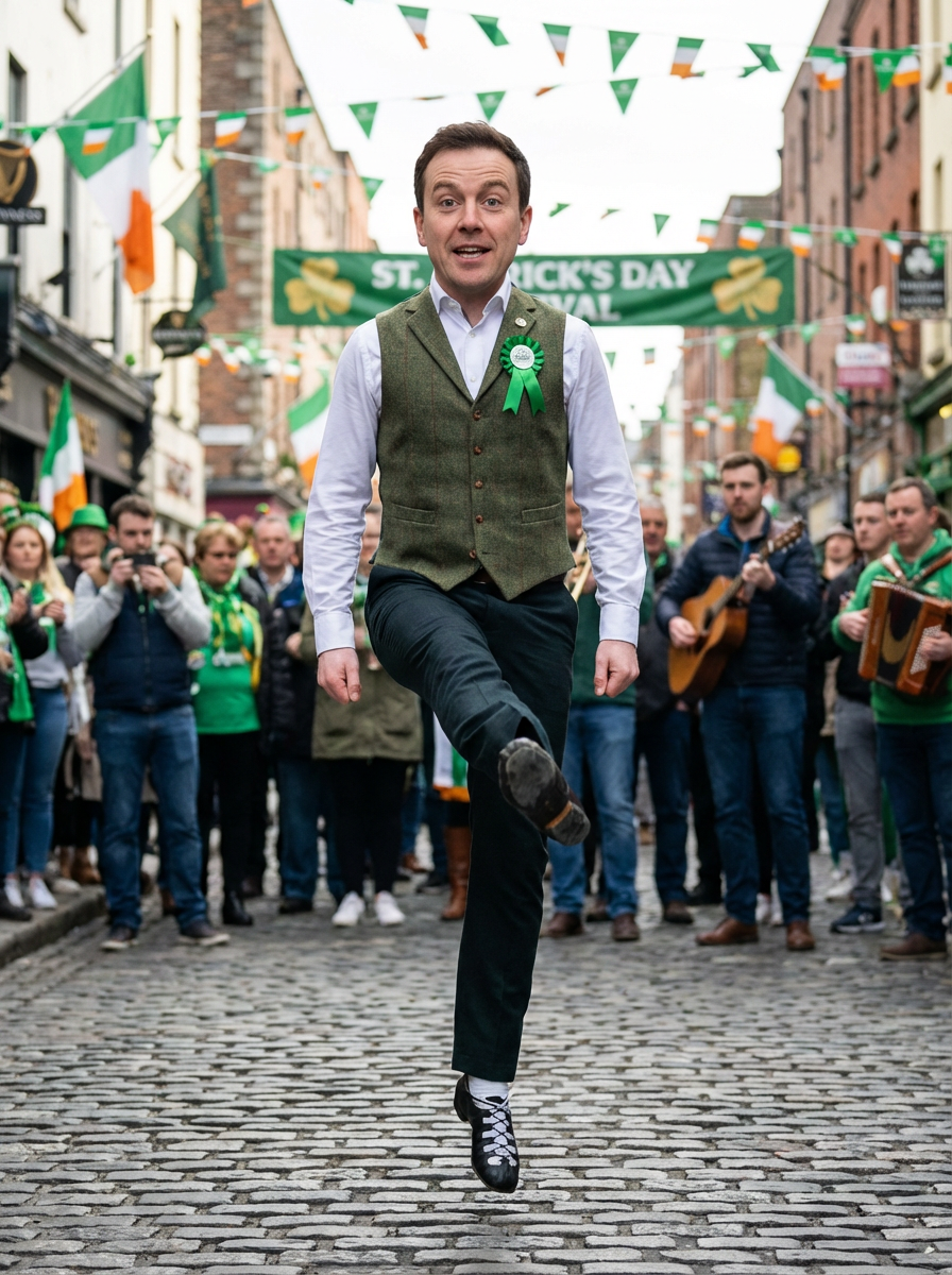 model doing Irish jig dance, St Patricks Day festivities, traditional elements, energetic pose