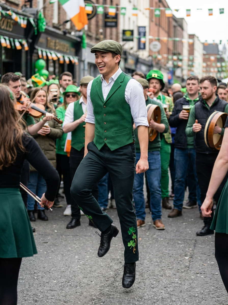 model doing Irish jig dance, St Patricks Day festivities, traditional elements, energetic pose